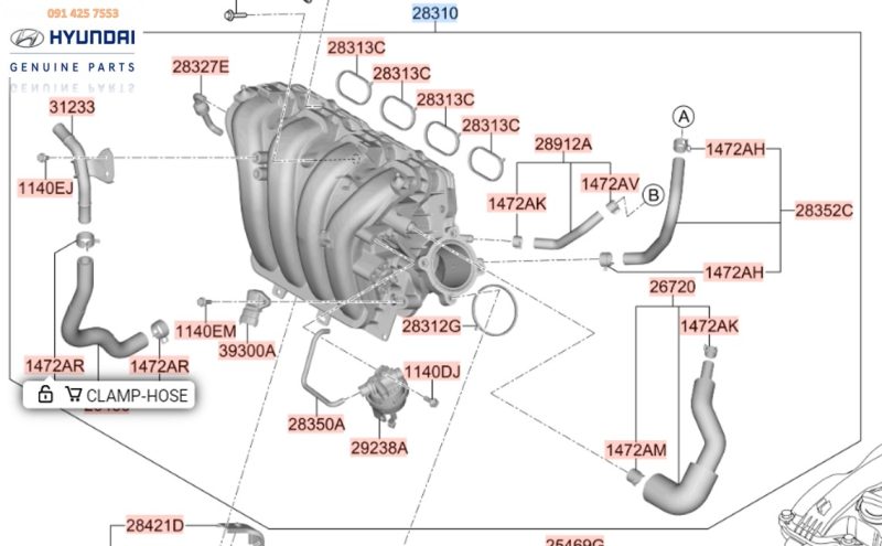 Cổ hút động cơ làm việc trong điều kiện nhiệt độ cao lên rất dễ bị lão hóa. Lâu ngày cổ hút có hiện tượng nứt vỡ. Nếu các yếu tố làm mát cho động cơ bị hỏng hay thiếu hụt như: Quạt làm mát két nước bị hỏng, thiếu nước làm mát hay thiếu dầu làm mát động cơ. Làm cho nhiệt độ động cơ quá cao dẫn đến chỗ tiếp giáp của cổ hút và mặt động cơ quá nóng làm sun bề mặt cổ hút. Tất cả các yếu tố trên làm hư hỏng cổ hút và làm giảm hiệu suất hoạt động của động cơ. Nếu phát hiện các dấu hiệu hư hỏng như trên. Cổ hút động cơ cần được thay thế bằng phụ tùng chính hãng Huhndai. Để hệ thống cung cấp không khí cho động cơ hoạt động ổn định, hiệu quả.